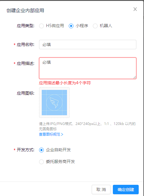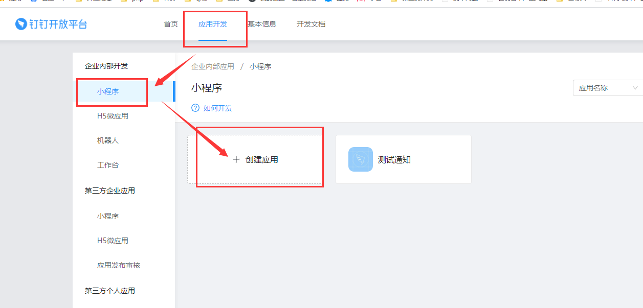 进入应用开发,根据需求选择应用创建类型,此处以企业内部开发为例,选择小程序==》创建应用;(注意:服务接口api使用不区分创建的是小程序还是H5微应用,均可使用。二者区别参考:https://ding-doc.dingtalk.com/doc#/bgb96b/ok9au2)