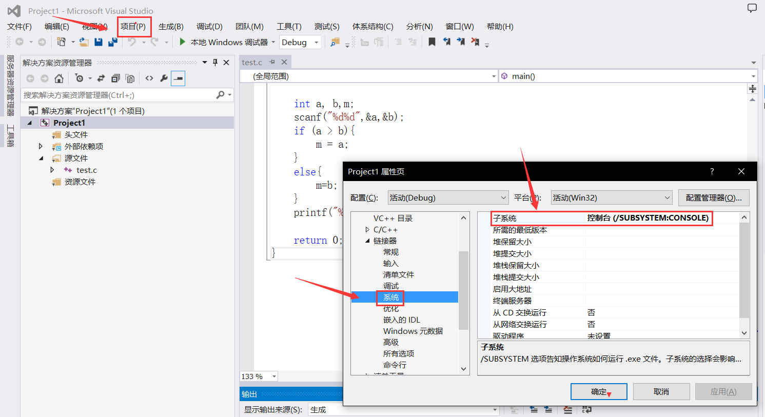 项目——>属性——>配置属性——>连接器——>系统——>子系统(subSystem), 然后将值配置为“控制台(/SUBSYSTEM:CONSOLE)” 。 确定返回就好了
