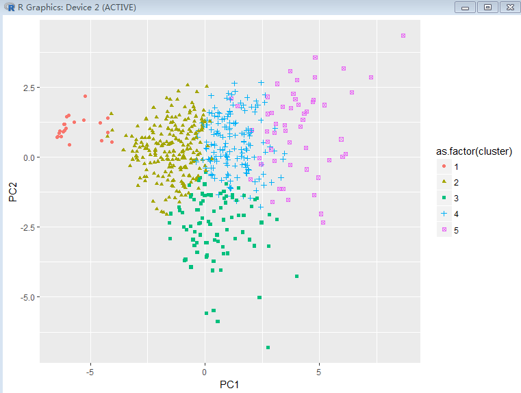 aes(x=PC1,y=PC2,col=as.factor(cluster), shape=as.factor(cluster))) +