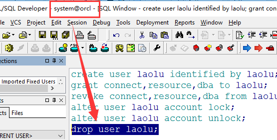 我们接下来把laolu这个用户删除掉,请看sql的正确运行姿势。删除时请保证用户以及退出,不然无法删除哦。