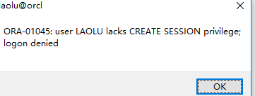 看下面完整的运行姿势。OK,创建完了用户,我们也给用户授权了,这回laolu可以登录系统了吧?别急,这里还要注意的是:创建用户、删除用户等权限只有数据库的管理员才有的哦,数据库的管理员一个是system,一个是dba。这个你需要记住哦!