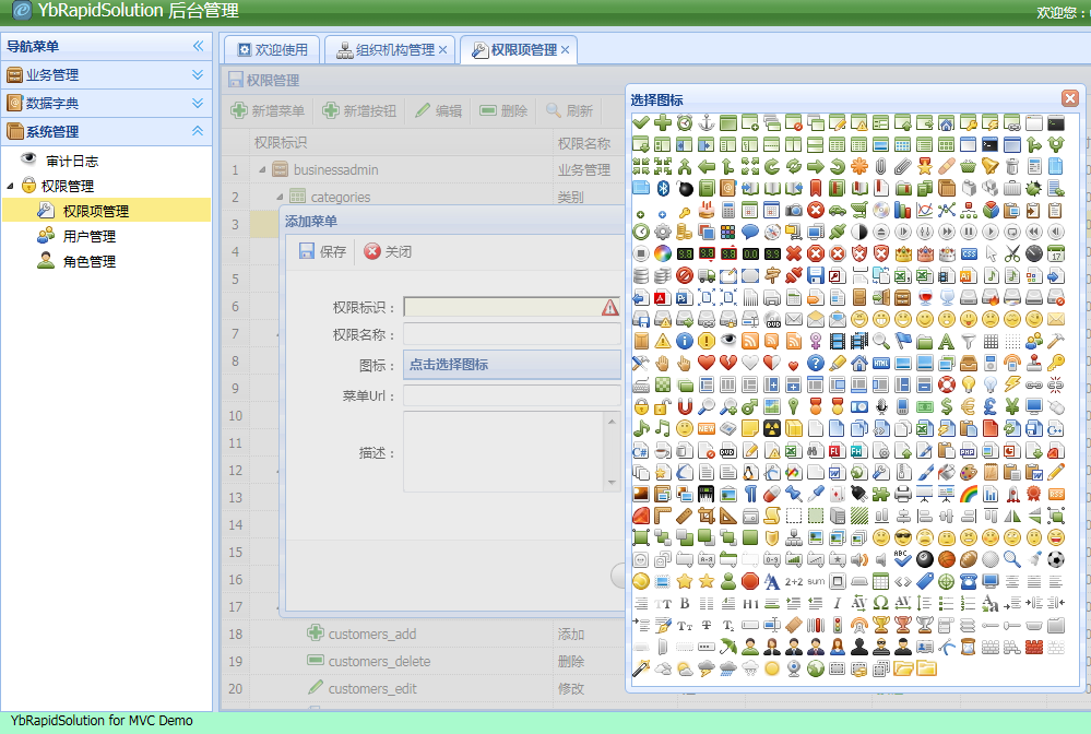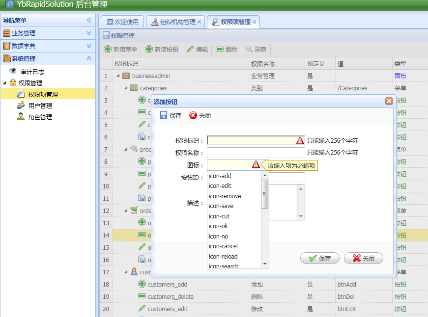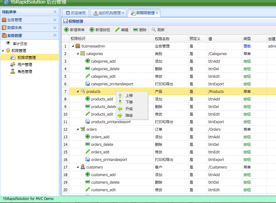 YbRapidSolution for MVC的权限项分为面板、菜单和按钮三类,顶层菜单被默认为分组面板并在左边的导航区域块标题中显示,同时每个分组面板还支持树形结构菜单。首先来看看界面效果(和组织机构管理一样,可以方便地通过右键菜单实现排序和升降级):