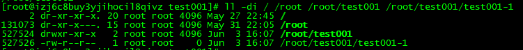 列出有关的目录和文件:ll -di / /root /root/test001 /root/test001/test001-1