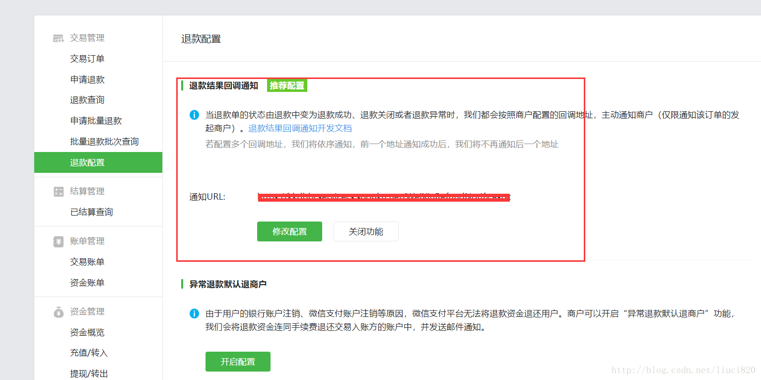 2.到微信商户平台开启退款通知配置;并配置退款通知接口地址;此地址用于接受退款结果通知的