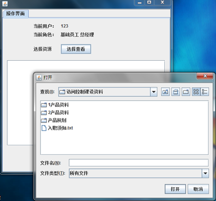 在登录后,会显示出当前用户名和当前用户的角色,在点击选择查看按钮后,会弹出一个选择文件的窗口,可以选择资源查看,如下图6-2所示: