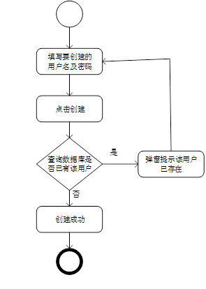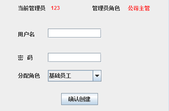 相应算法流程:在输入要创建的用户的用户名,密码,只能分配基础员工的角色。点击创建后,系统会首先查询数据库中是否已经有当前所输入的用户名,若已有,则创建失败,若没有,则成功创建。
