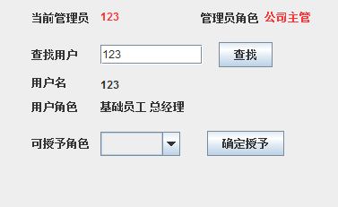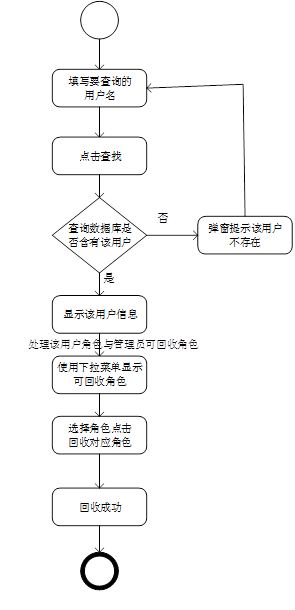 相应算法流程:在输入用户的用户名后,点击查找按钮查询数据库中的数据,若不存在该用户,系统会提示出错,若存在,则将该用户的角色显示出来,以及可授予的角色使用下拉菜单保存,管理员可选择相应的角色授予。