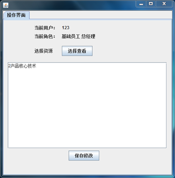 普通用户通过登陆进入系统后,可以执行查看功能选择以上的资料,点击查看按钮后,系统会通过对后台数据库的访问查询改用户的权限是否符合当前操作,若不符合,则拒绝该操作,若符合,则将该文件内容呈现至系统中;用户在修改完文件内容后,可以对文件进行保存修改的操作,此时系统将再次查询后台数据库,对用户是否有这样的权限进行确认。