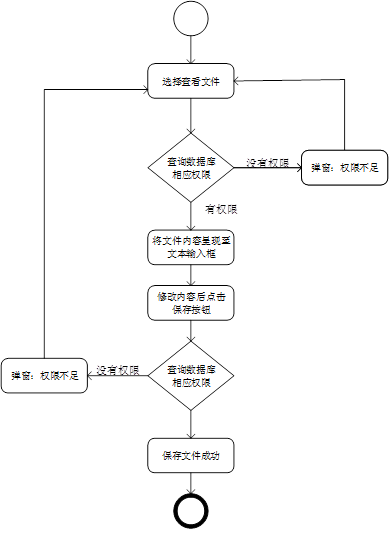 用户对文件进行修改后,点击保存修改按钮时,系统再次查询数据库中的权限数据,该用户是否对该文件有写入的权限,若有,则保存当前数据至该文件,若没有,则提示无法保存,权限不够。