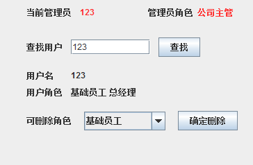 相应算法流程:在管理员输入相应的用户名之后,点击查找即查询数据库中的用户数据,若不存在,则提示错误,若存在则显示用户角色以及对应该管理员的可删除的角色,可删除的角色使用下拉菜单显示出来,管理员选择相应的角色点击删除后,用户的角色即被删除。