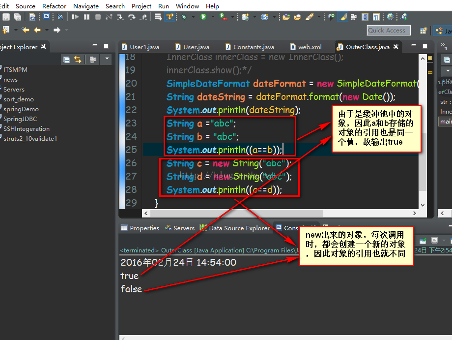 Java为String类型提供了缓冲池机制,当使用双引号定义对象时,Java环境首先去字符串缓冲池寻找相同内容的字符串,如果存在就直接拿出来应用,如果不存在则创建一个新的字符串放在缓冲池中。示例代码如下: