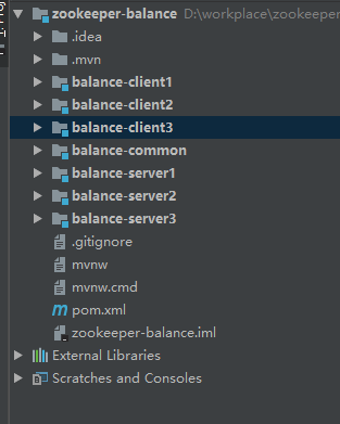 5、新建工程zookeeper-balance,并新建子模块:balance-server1, balance-server2,balance-server2,balance-client,balance-client2,balance-client3以及balance-common。