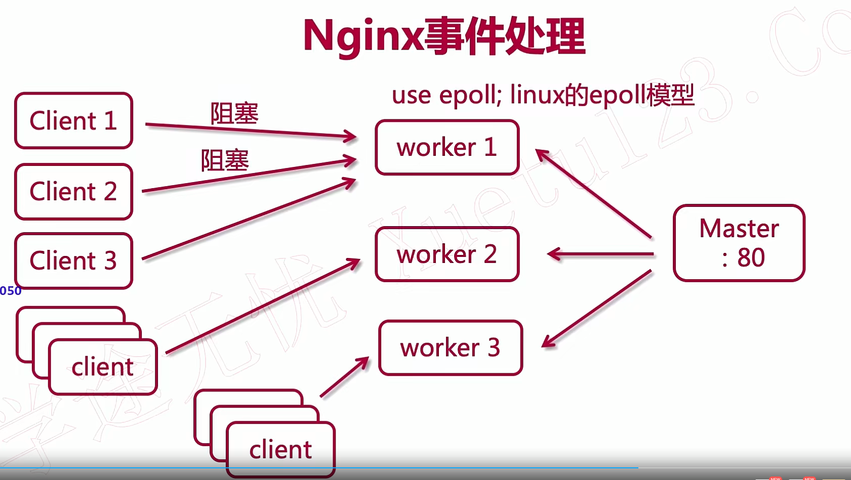 2)使用了epoll模型: 当一个worker进程接收到客户端的请求时发生阻塞现象,它会去进行下一个请求;