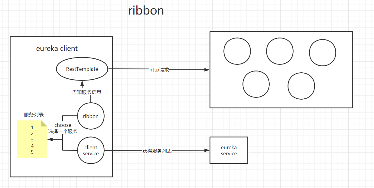 eureka客户端从eureka服务器获得服务列表,ribbon使用策略获得一个服务,RestTemplate向这个服务发送http请求