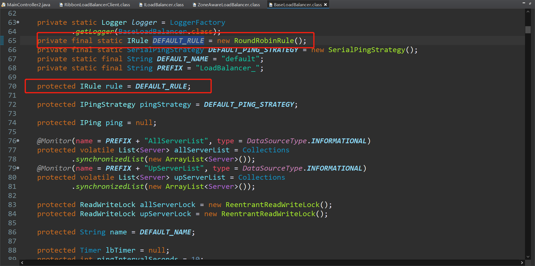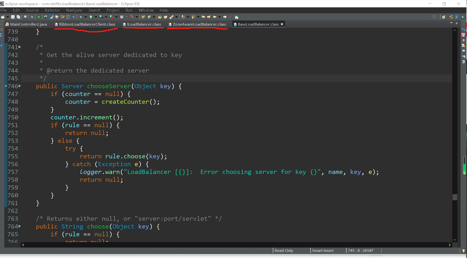 查找 loadBalancer.chooseServer实现方法,选择ZoneAwareLoadBalancer类