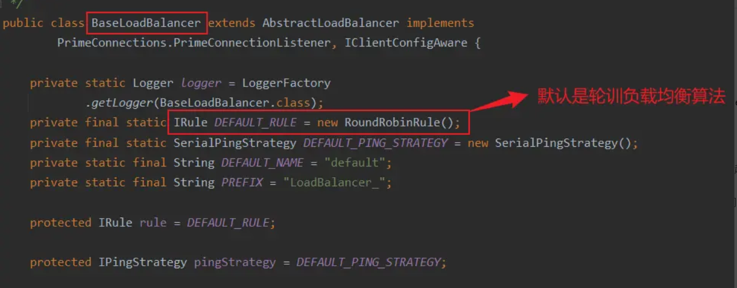 OpenFeign底层使用的是Ribbon做负载均衡的,查看源码我们可以看到它默认的负载均衡策略是轮询策略,源码位置:com.netflix.loadbalancer.BaseLoadBalancer,如下图所示: