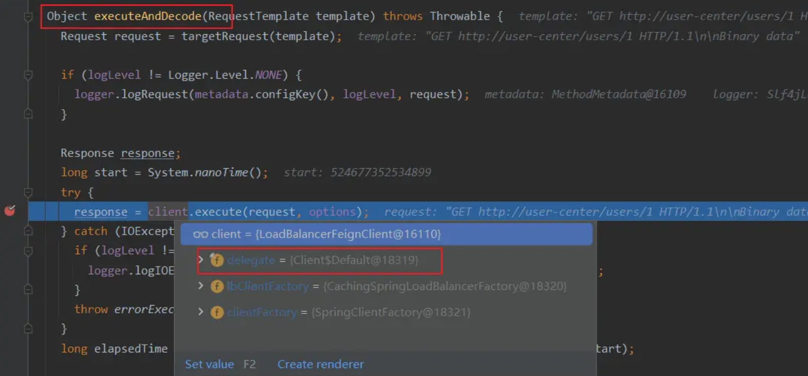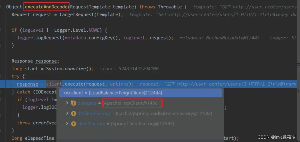 验证Apache HttpClient配置是否生效,通过debug调试,在feign.SynchronousMethodHandler#executeAndDecode()方法上打端断点,通过发起一个远程调用请求,在没配置替换前,是这样的: