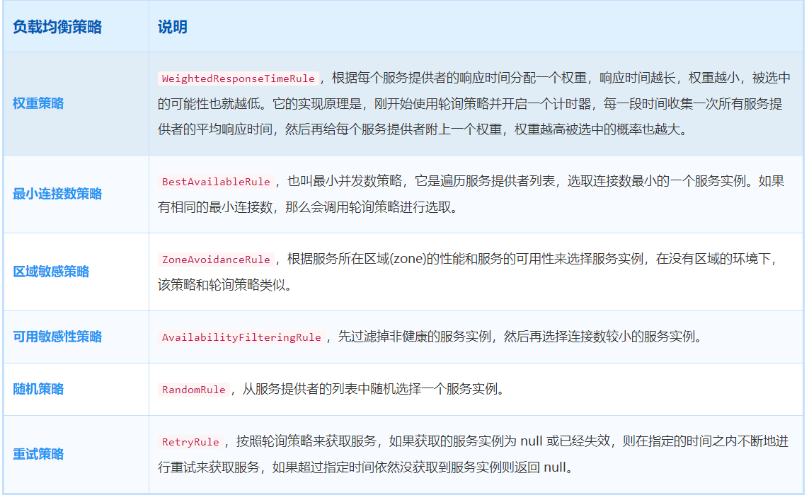 然而除了轮询策略之外,我们还有其他6种内置的负载均衡策略可以选择,这些负载均衡策略如下: