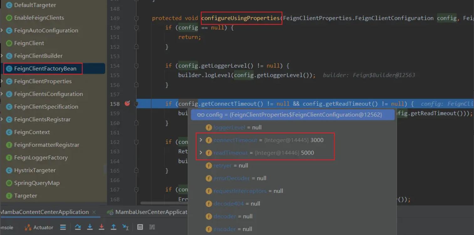 通过debug的方式验证以下设置的超时时间是否生效,很明显配置已经生效,主要看org.springframework.cloud.openfeign.FeignClientFactoryBean#configureUsingProperties()方法,源码如下图所示: