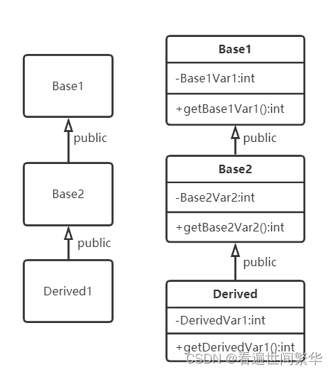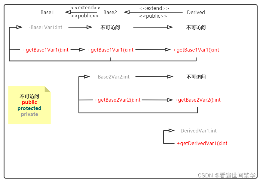 根据类构造对象的过程,制作上图所示的不同类中的数据和函数成员以及在当前类中的访问权限。private经过public继承后在当前类中不可访问,Base1Var1和Base2Var2经过继承后到Derived中是不可访问的,这也体现了数据的逐层封装;而留下来的public成员函数刚好提供访问私有数据的接口,使得无论是在类内还是类外访问成员函数,都能得到已经被层层封装保护的数据。