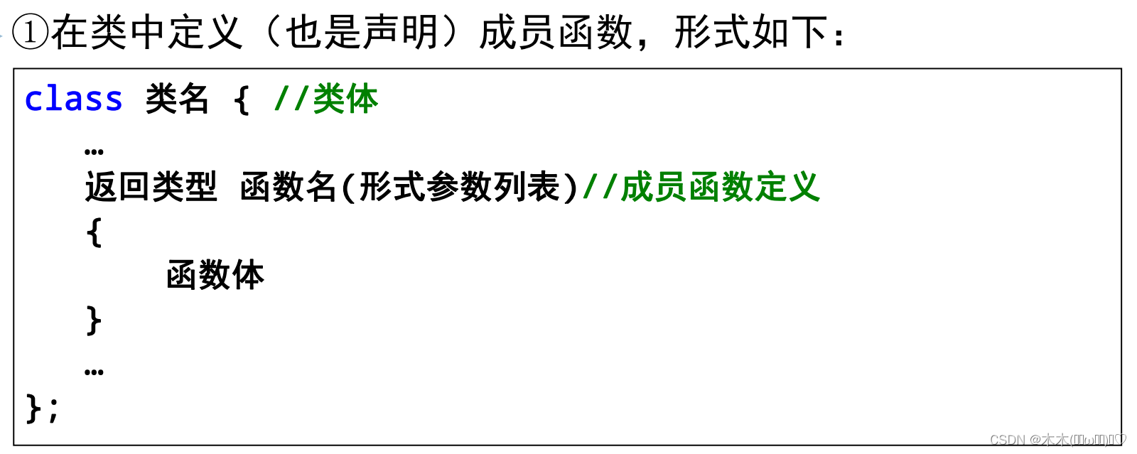 其中成员列表(member list)是类成员的集合,数目可以任意多, 由具体应用确定。一对大括号{}是成员列表边界符,与成员列表一起称为类体(class body)。类体后面必须用分号(;)结束。