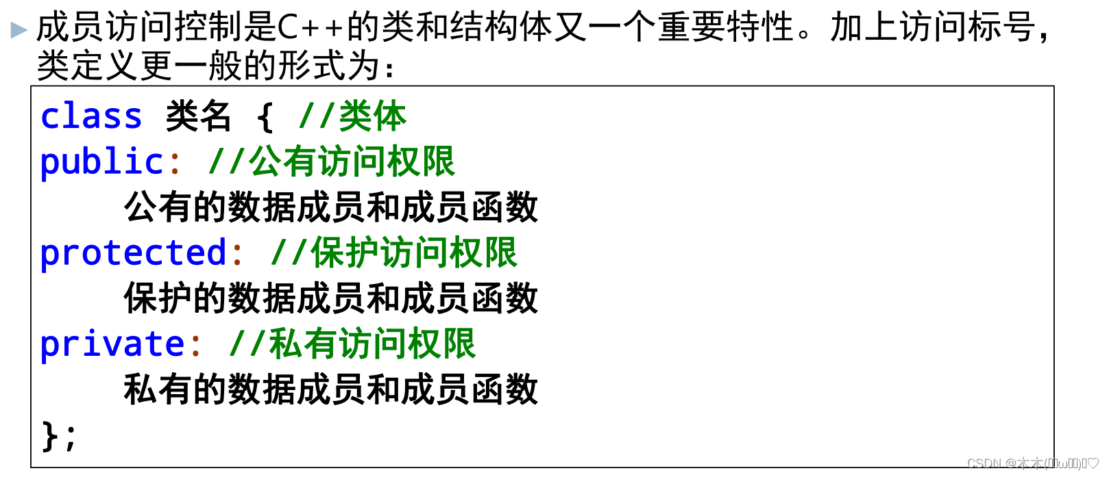 无论数据成员还是函数成员,类的每个成员都有访问控制属性,由 以下三种访问标号说明:public(公有的)、private(私有的)和protected(保护的)。