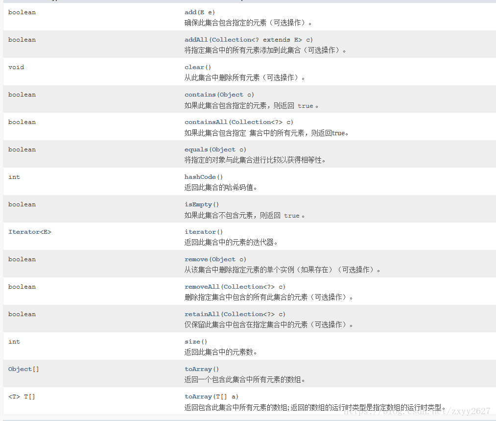 在Java类库中,集合类的基本接口是Collection接口,这个接口有两个常见的方法: