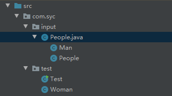 1.创建两个包,取名为com.syc.test和com.syc.input,然后在com.syc.test下创建Test类、Woman类,com.syc.input下创建People类