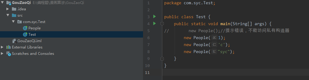 我们在com.syc.Test包下新建Test类,发现不能访问无参的私有构造器(private People(){})。