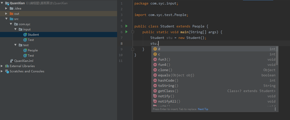 我们在com.syc.input中新建Student类,使这个类继承自People,然后我们可以看到能访问到父类的protected 成员c。