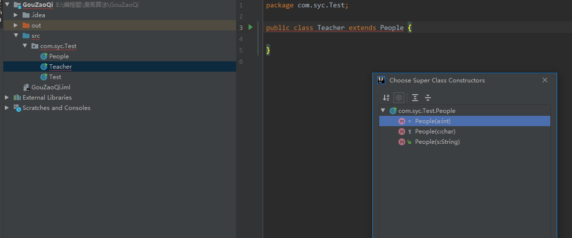 我们在com.syc.Test包下,新建Teacher类,继承自People类,如图所示,会提示错误:在com.syc.Test.People中没有默认的构造器,要我们创建构造器来匹配父类。为什么会有这个提示呢?因为在我们的父类People中“没有默认构造器”。(无参构造器被私有化,外部类无法访问,其他三个构造器又不能被子类继承)