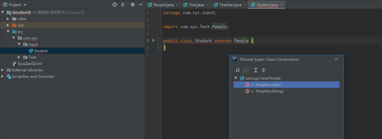 若我们创建一个新包com.syc.input,并在其中创建Student类,使其继承People类,那么此时能创建的子类构造器只有两个(父类中用protected与public修饰的构造器)