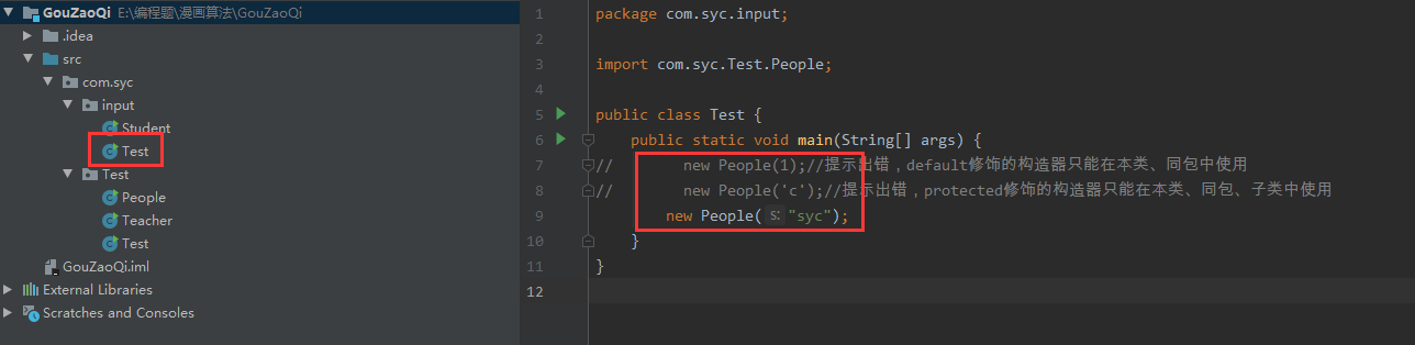 我们新建一个包com.syc.input,也创建一个类Test,此时在main方法中测试,发现只能访问public方法修饰的构造器(public People(String s){})