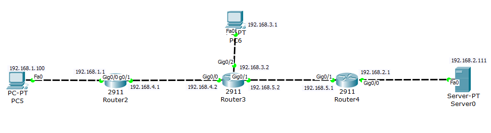 思考:pc5对pc6和server0服务器进行访问都会经过Router2路由器,如果把ACL设置在3和4的路由器上数据发送过程前面就会经过更多的路由器,路由器还要对数据包进行拆分解析,再包装,过程会影响数据发送的效率所以选择在Router2路由器上去设置,因为pc5发送数据出去从路由器的g0/0方向发送,再思考如果把ACL设置在路由器的g0/1接口数据出去的方向数据就还是会经过路由器对数据包进行拆分再包装,所以就把ACL放在路由器的g0/0接口的in