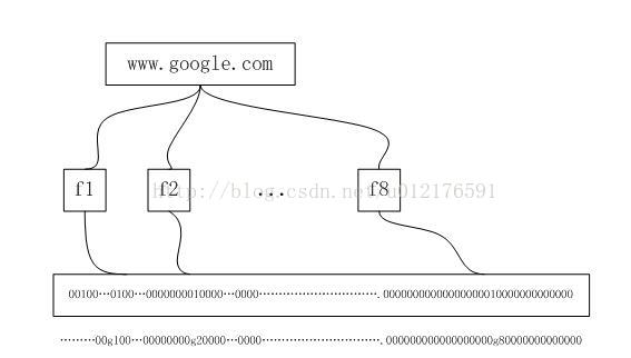 假定存储一亿个WEB页面地址,先建立一个16亿二进制(比特),即2亿字节的向量,然后将这16亿个二进制位清零。对于每一个WEB页面地址X,用8个随机数产生器(f1,f2,...,f8)。再用一个随机数产生器G把这8个信息指纹映射到1-16亿中的8个自然数g1,g2,...g8。现在把这8个位置的二进制位都置为1。对着一亿个WEB页面地址都进行这样的处理后,一个针对WEB页面的布隆过滤器就建成了,见下图。
