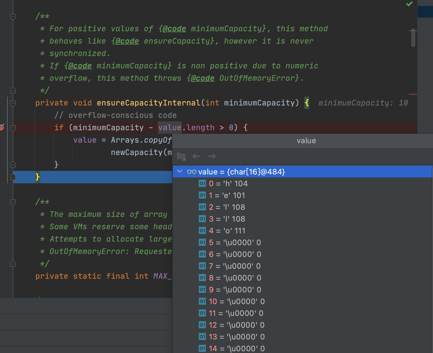 private void ensureCapacityInternal(int minimumCapacity) {