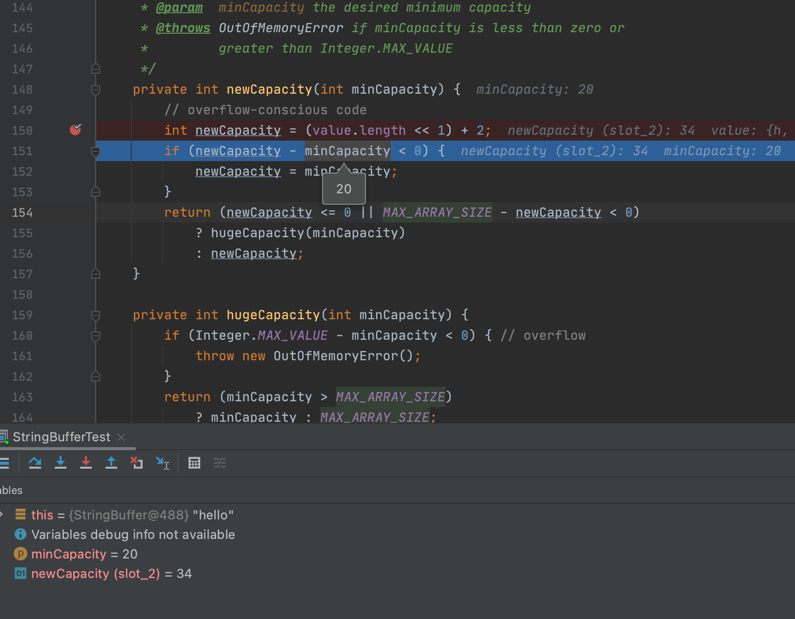 if (newCapacity - minCapacity < 0) {
