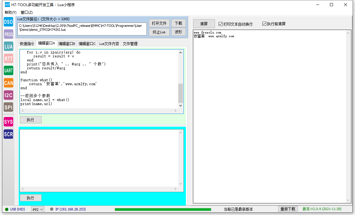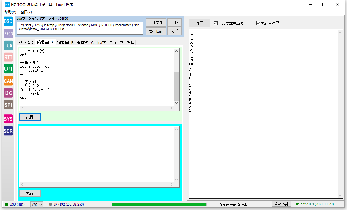 LUA脚本的好处是用户可以根据自己注册的一批API(当前TOOL已经提供了几百个函数供大家使用),实现各种小程序,不再限制Flash里面已经下载的程序,就跟手机安装APP差不多,所以在H7-TOOL里面被广泛使用,支持在线调试运行,支持离线运行。