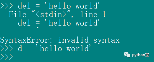 在实际开发中,如果使用 Python 中的保留字作为标识符,则解释器会提示“invalid syntax” 的错误信息,如图所示:
