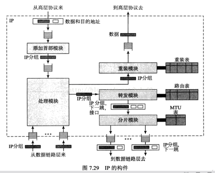 可以认为IP软件包包含八个构件:首部添加模块、处理模块、转发模块、分片模块、重装模块、路由表、MTU表和重装表。此外,在软件包中还包括一些输入和输出队列。