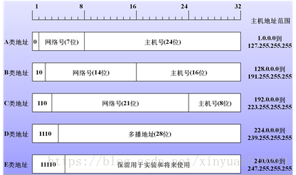 IP地址的分类有5中分类:A类,B类,C类,D类和E类地址