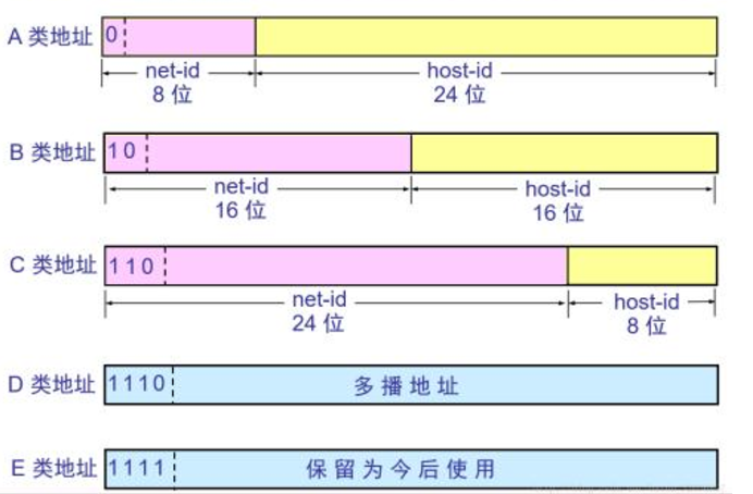 在最初定义Internet地址结构时,每个单播IP地址都有一个网络部分,用于识别接口使用的IP地址在哪个网络中可被发现;以及一个主机地址,用于识别由网络部分给出的网络中的特定主机。因此,地址中的一些连续位称为网络号,其余连续位称为主机号。基于上述分类方法,IPv4地址按照网络号和主机号的长度被分为五大类。A、B、C类用于为Internet(单播地址)中的设备接口分配地址,以及其他特殊情况下使用。类由地址中的头几位来定义:0为A类,10为B类,110为C类,1110为D类,1111为E类。D类地址供组播使用,E类地址保留。分类如下图所示: