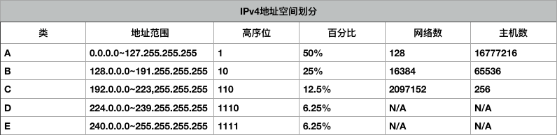 由此可得出按此分类方式得到的IPv4地址空间划分: