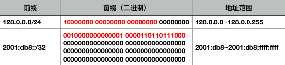 使用CIDR,未经过预定义的任何地址范围可作为一个类的一部分,但需要一个类似于子网掩码的掩码,有时也称为CIDR掩码。CIDR掩码不再局限于一个站点,而对于全球性路由系统都是可见的。因此,除了网络号之外,核心Internet路由器必须能解释和处理这种掩码。这个数字组合称为网络前缀,它用于IPv4和IPv6地址管理。消除一个IP地址中网络号和主机号的预定义分隔,将使更细粒度的IP地址分配范围称为可能。与分类寻址类似,地址空间分割成块最容易通过数值连续的地址来实现,以便用于某种类型或某些特殊用途。一个n位的前缀是一个IP地址的前n个位的预定义值。对于IPv4,n(前缀长度)的值通常在范围0~32,对于IPv6则是0~128。它通常被追加到基本IP地址,并且后面跟着一个/字符。如图所示: