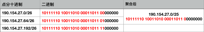 通过取消分类结构的IP地址,能分配各种尺寸的IP地址块。但这样做只是进一步提高了IP地址的划分细粒度,而并没有减少路由表的条目数。路由聚合通过将相邻的多个IP前缀合并成一个短前缀(称为一个聚合或汇聚),可以覆盖更多地址空间。例如,三个IP地址:190.154.27.0/26,190.154.27.64/26,190.154.27.192/26,其二进制表示如下: