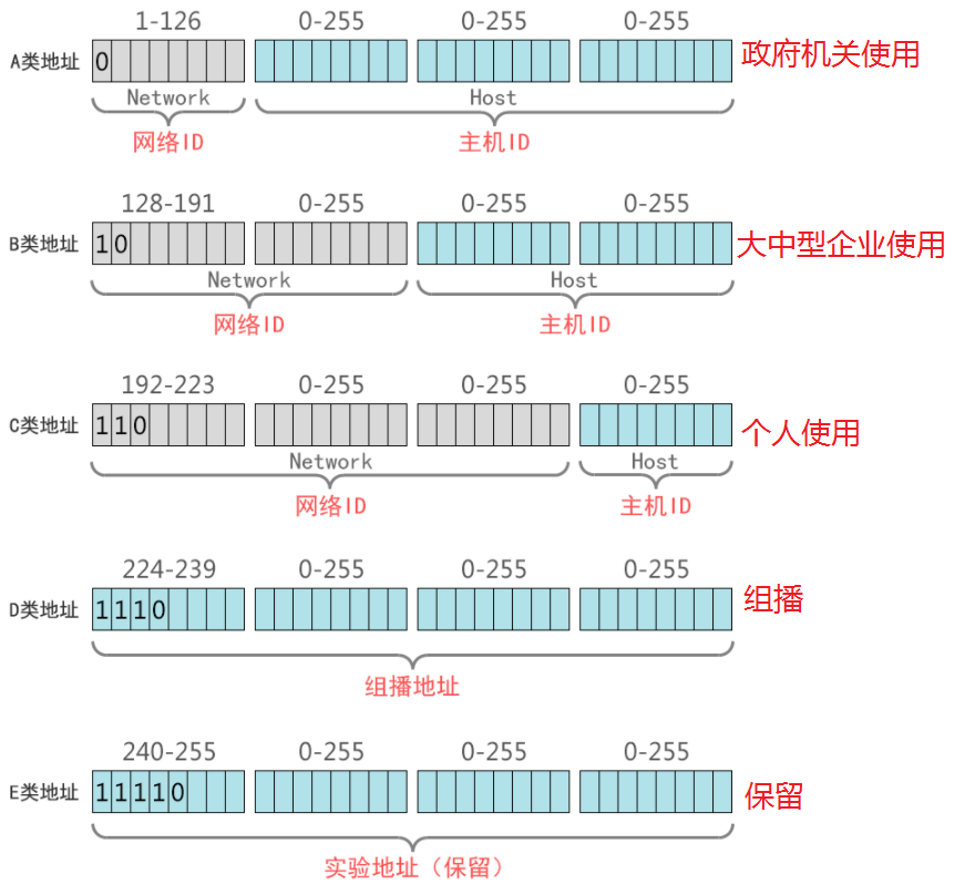 IP地址一共分为5类,即A~E,它们分类的依据是其net-id所占的字节长度以及网络号前几位。