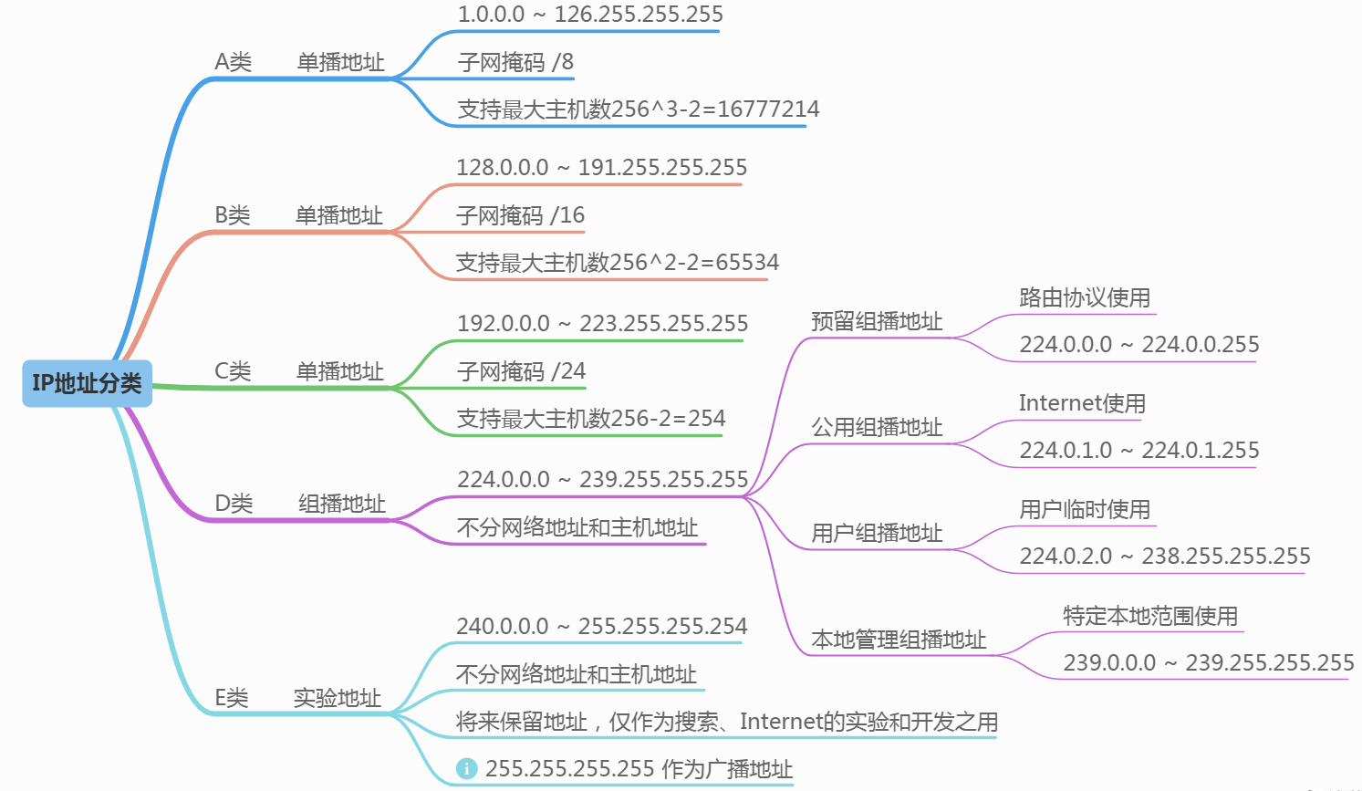 - E类地址用于研究,前五位为11110,保留为以后使用,范围是240.0.0.1—255.255.255.254。