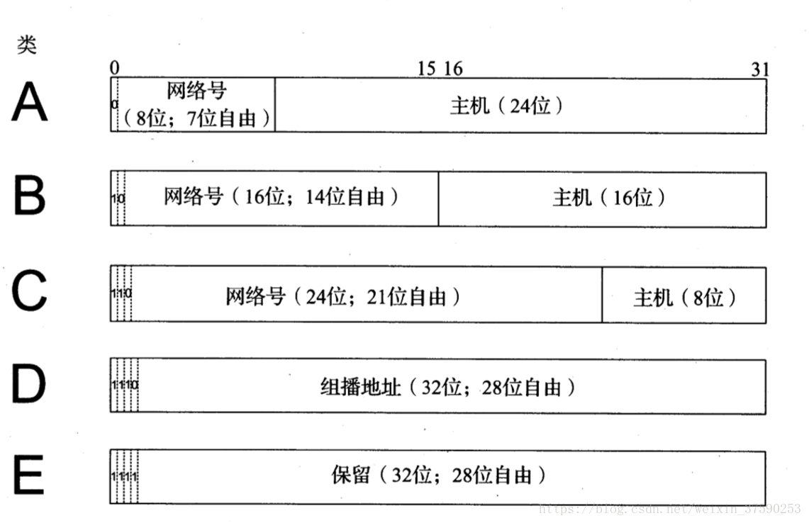 IPv4的地址空间划分:A,B,C,D,E五大类,每类都基于网络中可容纳的主机数量,确定在一个32位的IPv4地址中分配给网路号和主机号的位数,如图显示了这个基本思路。