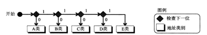 计算机以二进制方式存储ipv4地址,在这种情况下可以和方便的写出一种算法,通过一个连续检查过程来查找出该ip地址的类别。流程图如下:
