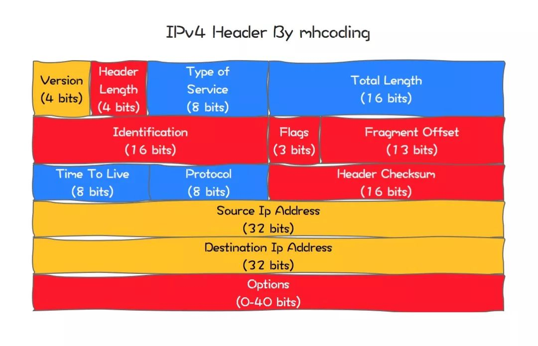 上图是一张IPv4报文的首部格式,可以看到,IPv4首部中包含的内容还是很多的,比如版本号,首部长度,标识符,分片偏移,存活时间,协议等。